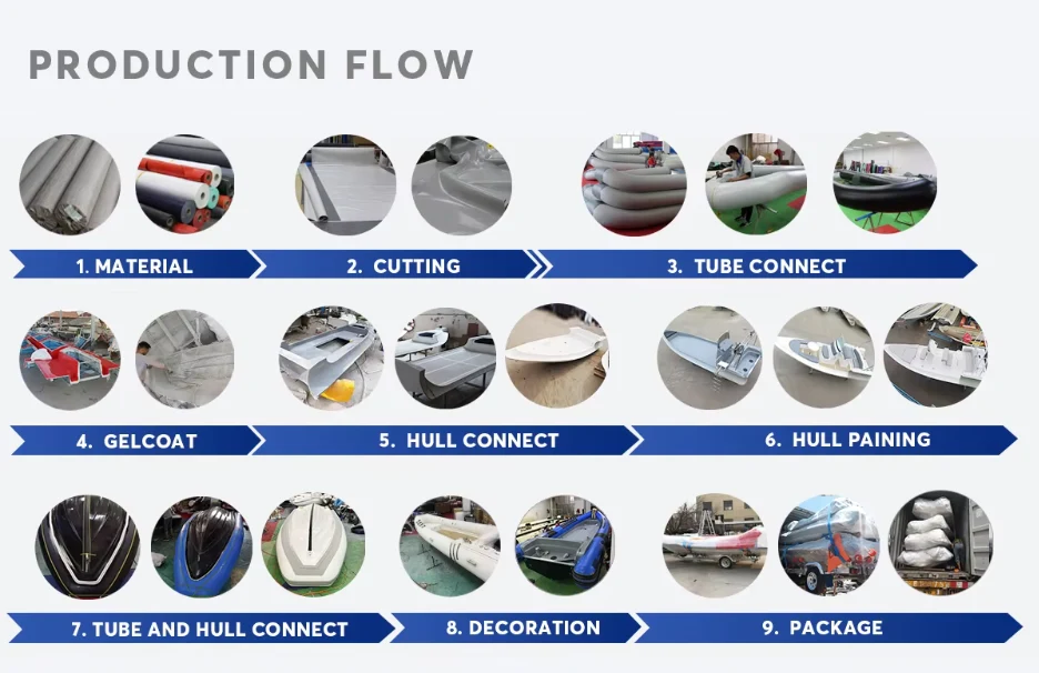 1.Tất cả thuyền sườn sợi thủy tinh của chúng tôi đều được làm bằng thân sợi thủy tinh chất lượng cao và ống hypalon cấp biển.